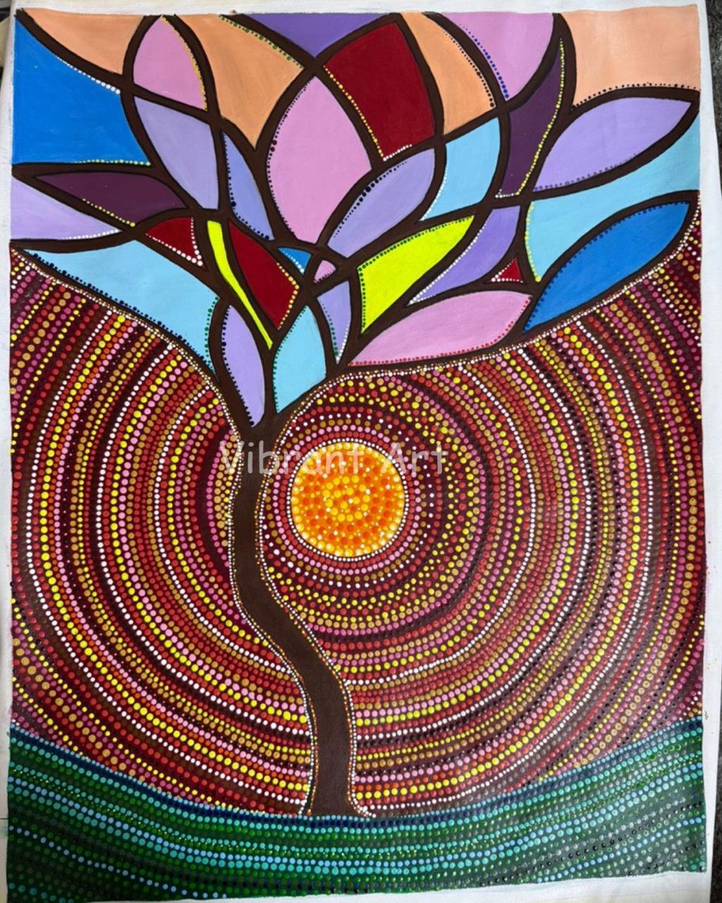 A bold and spiritual interpretation of the Tree of Life, this hand-painted acrylic artwork bursts with vibrant colors and intricate mandala dot patterns radiating around a glowing sun. The upward-branching tree symbolizes growth, strength, and connection to the universe, while the radiant mandala invokes harmony and life energy.